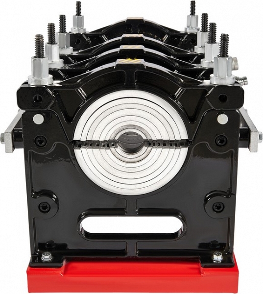 - Центраторо с гидравлическим приводом и 4-мя прочными широкими зажимами, один из которых легко может быть удален для облегчения сварки полимерных фитингов с трубами (тройники, крестовины, отводы), имеет большой запас прочности за счет качественного сплава и ребер жесткости, что позволяет сваривать полимерные трубы с любым показателем SDR